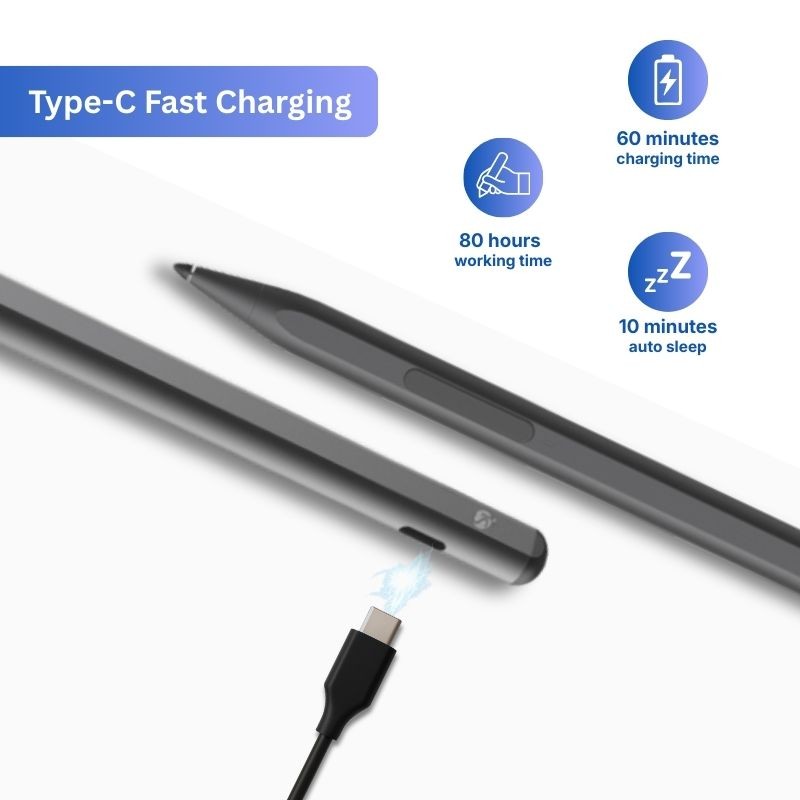 Este lápiz para tableta Windows también cuenta con una batería de larga duración que se carga mediante un cable USB-C. La punta es reemplazable y el indicador luminoso indica con precisión el estado de la batería. El botón lateral tiene varias funciones, como encender, apagar, borrar e incluso funciona como ratón. Todo esto con practicidad, rapidez y precisión.